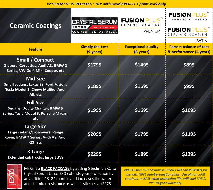 The pricing chart below is based on vehicles with new or nearly perfect paintwork. If your paintwork is more than a year old, you should anticipate some level of polish, enhancement, or correction. This work must be done prior to applying the coating and could range from $400 to $1800 in additional cost depending on the condition of the paintwork and size of the vehicle.