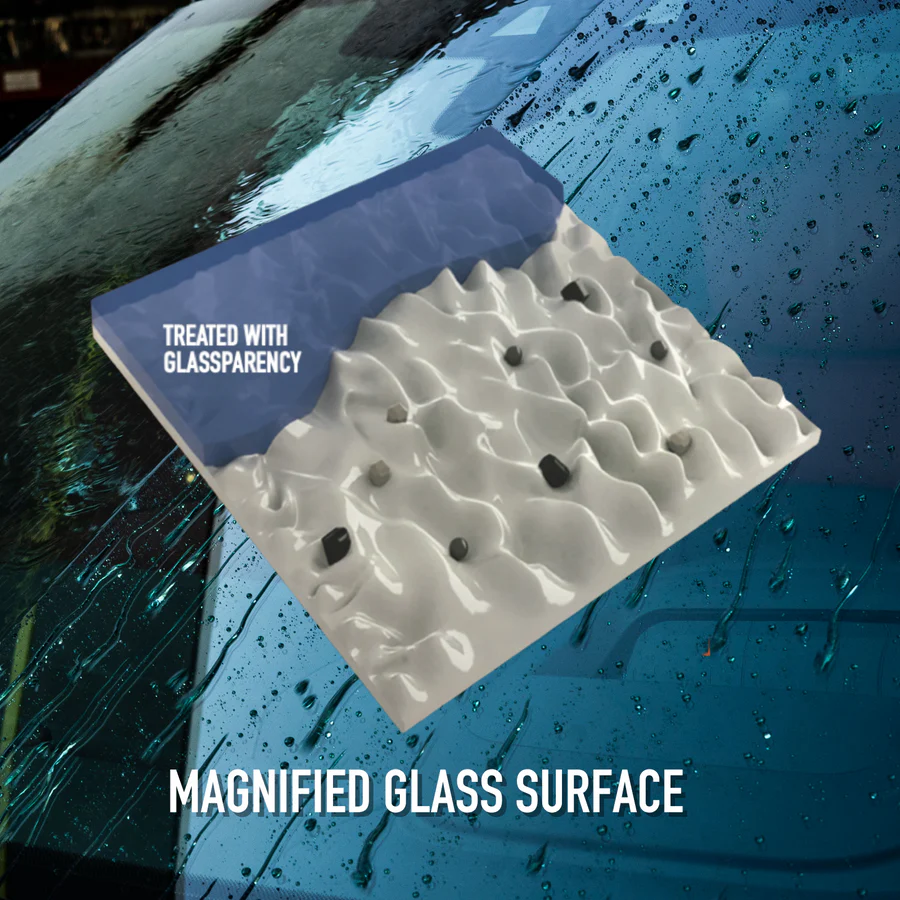 Unlike wax-based or topical coatings for rain, GlassParency is engineered to bond with the silica within glass, creating long-term, durable protection.